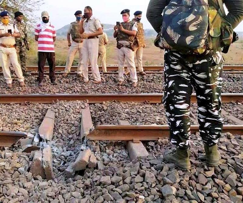Sonua: Security forces at the spot where alleged Maoist blew up a railway track (Howrah-Mumbai Main Line) in Lotapahar area of Sonua, Jharkhand, Monday, April 26, 2021. The Eastern Regional Buro (ERB) of CPI (Maoist) has called for a Bharat bandh on April 26 against the killing of their cadres by security forces in Chhattisgarh and Bihar during Operation Prahar. (PTI Photo)(PTI04_26_2021_000094B)